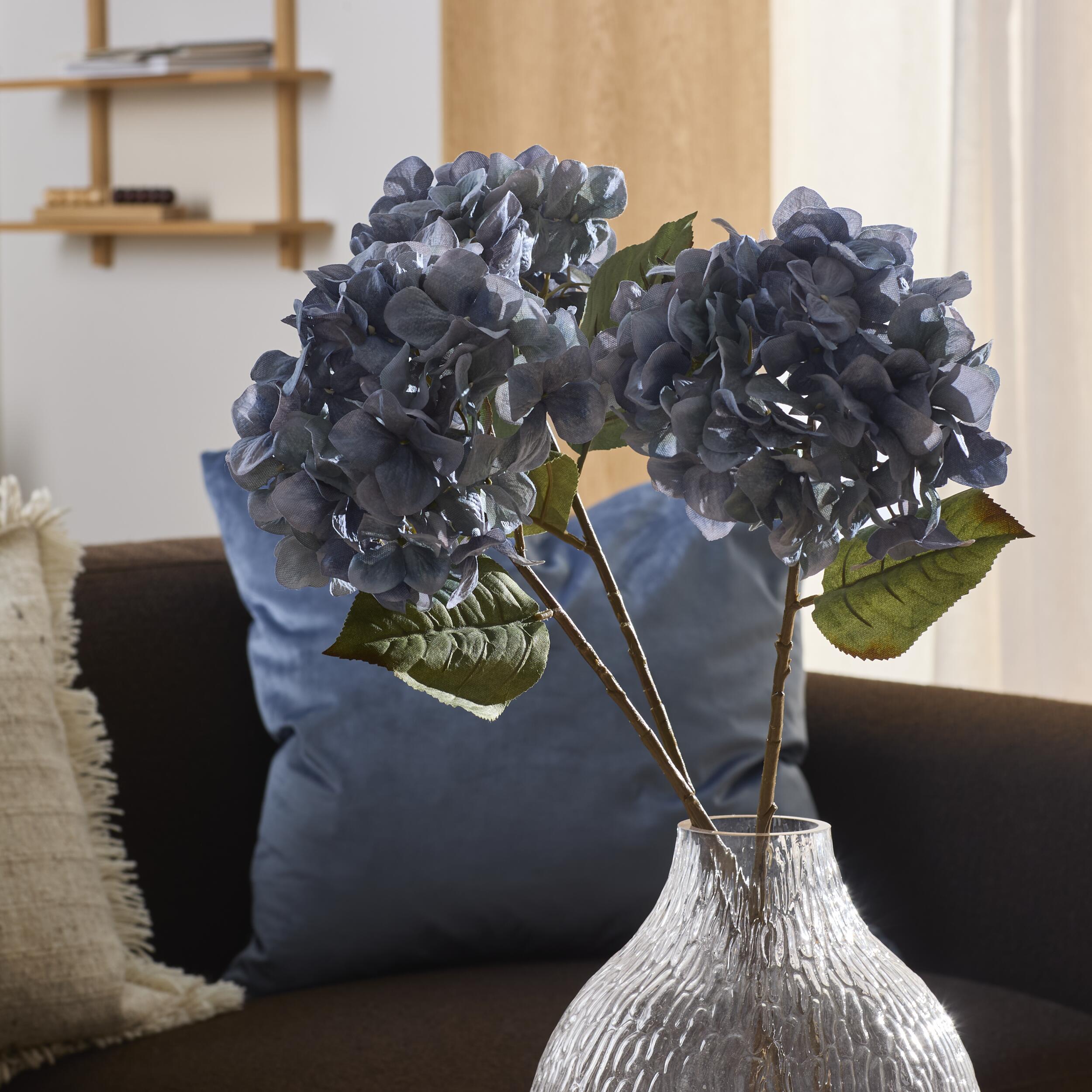 Konstgjord hortensia med blå blommor och brun stjälk. Det naturtrogna uttrycket gör den idealisk som solitär i en vas. Tillför mjukhet och färg i rummet – helt utan underhåll eller säsongsberoende.
