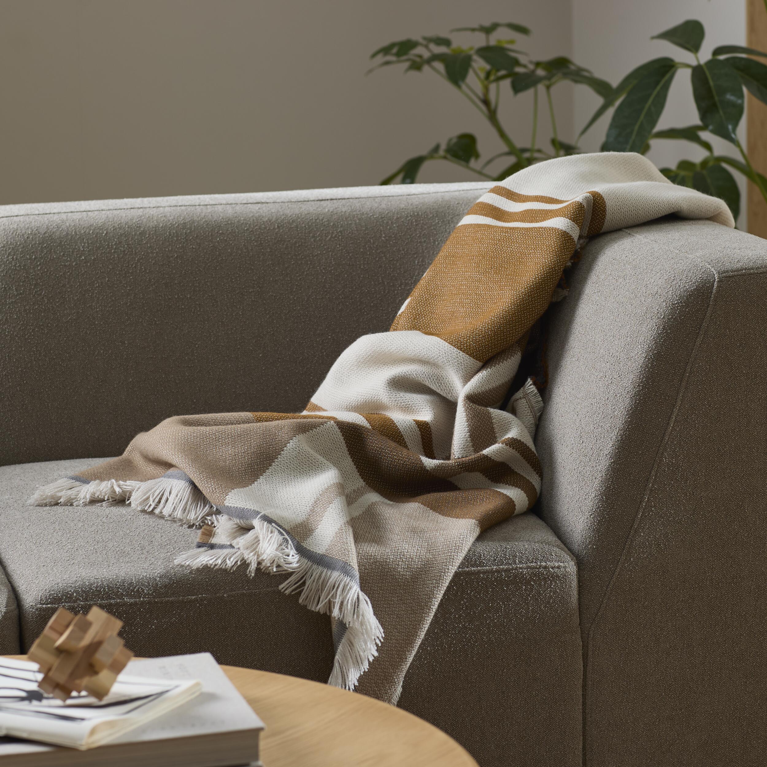 • Pläd i beige, vitt och mörkblått akryl och polyester med fransar. Färgkombinationen skapar visuell värme och materialet ger en mjuk känsla. Använd i soffan eller som dekorativt lager i sovrummet.
