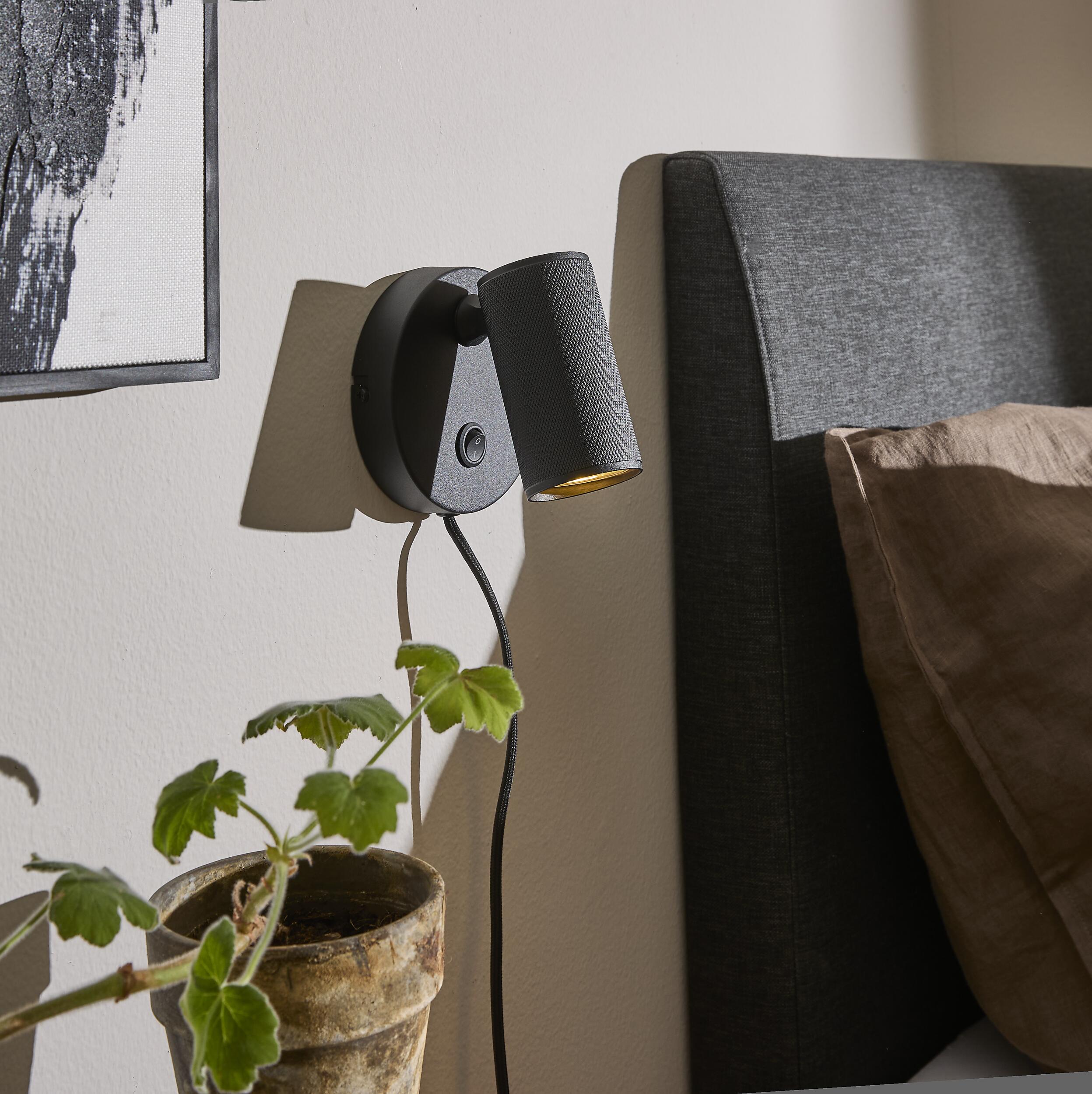 Vägglampa i svart metall med en svart metallarm och -bas samt en 1,5 meter lång svart textilsladd. Lampan är cylinderformad och har en ribbad yta som ger den ett unikt utseende. Lampan levereras utan glödlampa. Den har 5 års garanti.